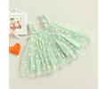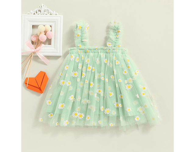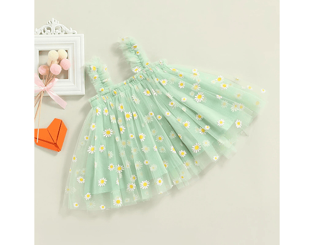 Vestido de margaritas, hermoso y delicado vestido elaborado de tul, con una capa de fondo en algodón, y hermosos apliques en margaritas color amarillo y blanco.